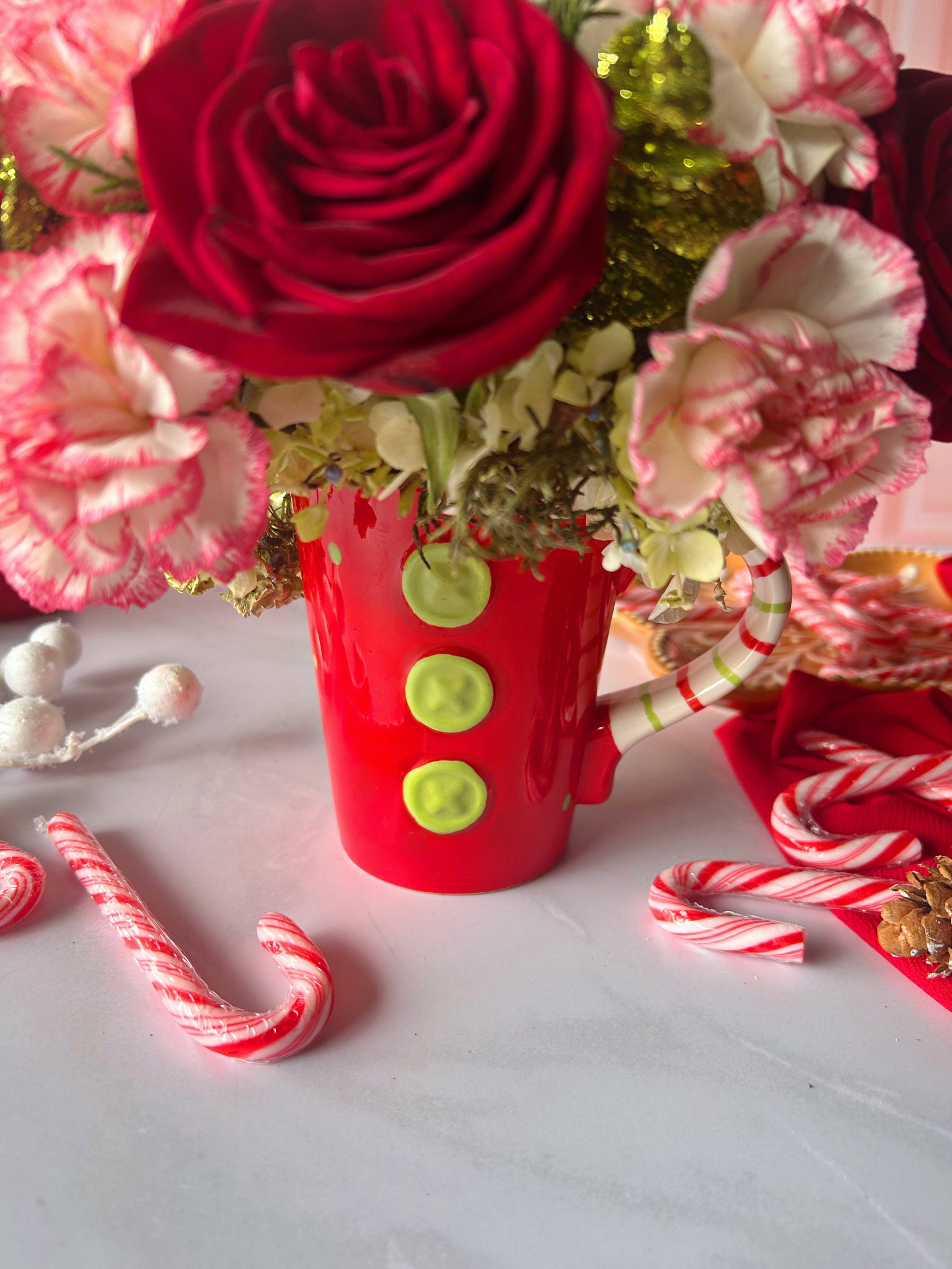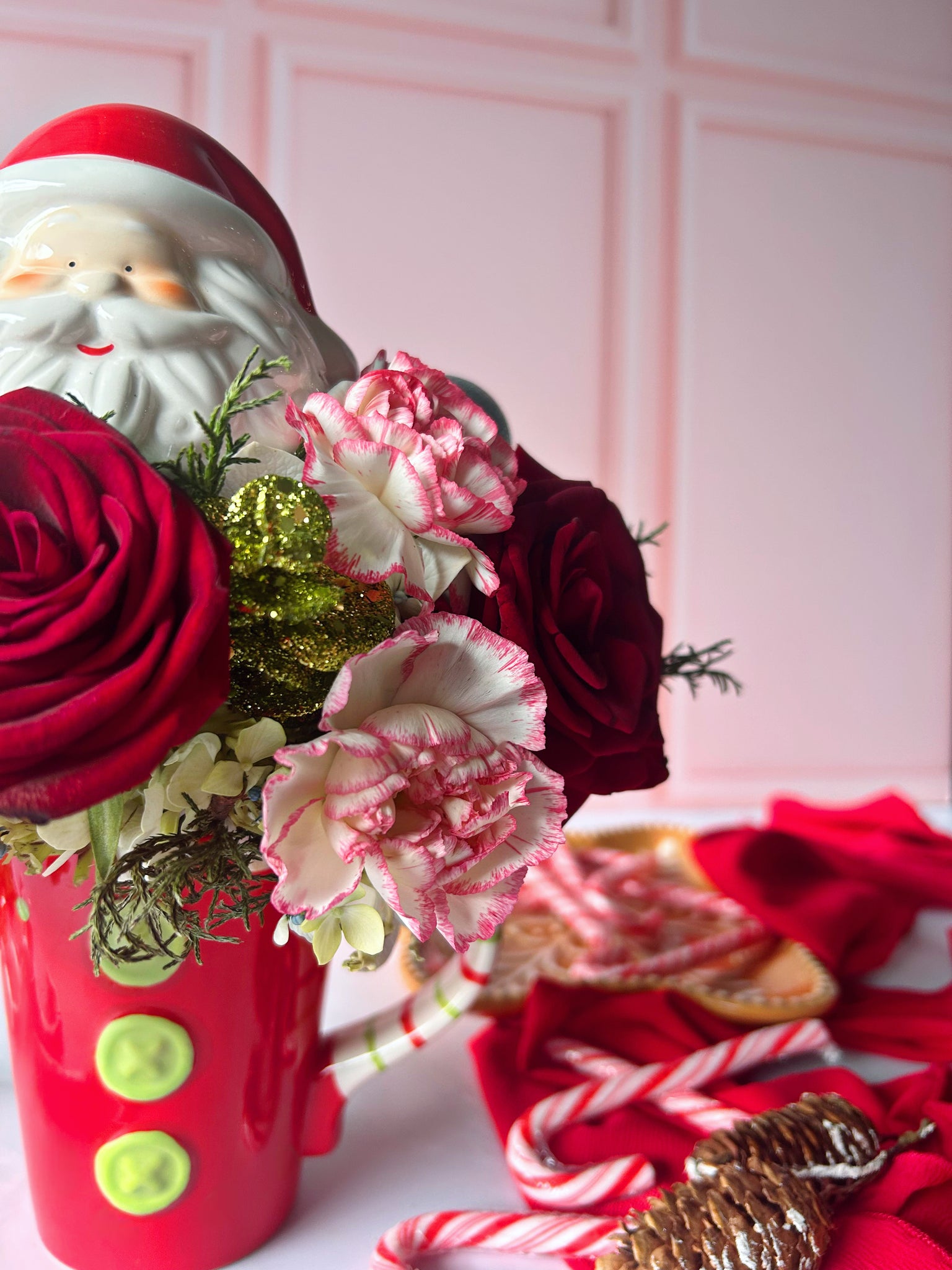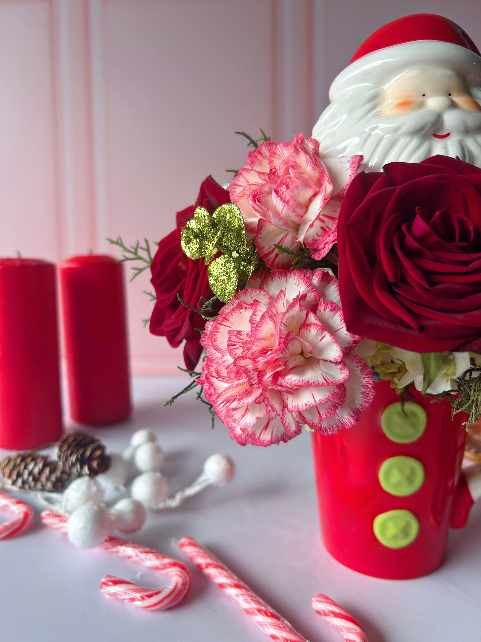 - Arreglo floral navideño presentado en una encantadora taza de Santa con tapa decorativa.