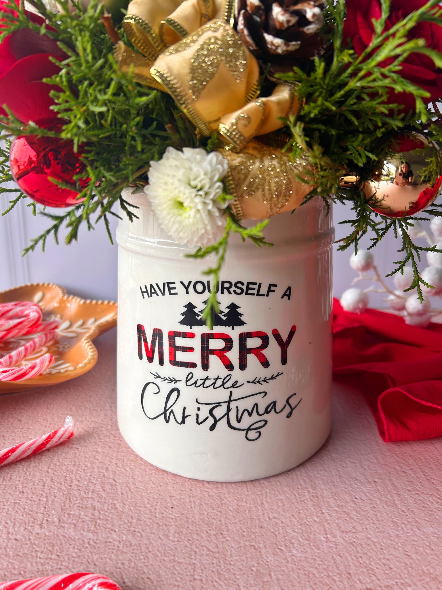 - Arreglo navideño elaborado en un contenedor estilo galletero con un mensaje festivo.