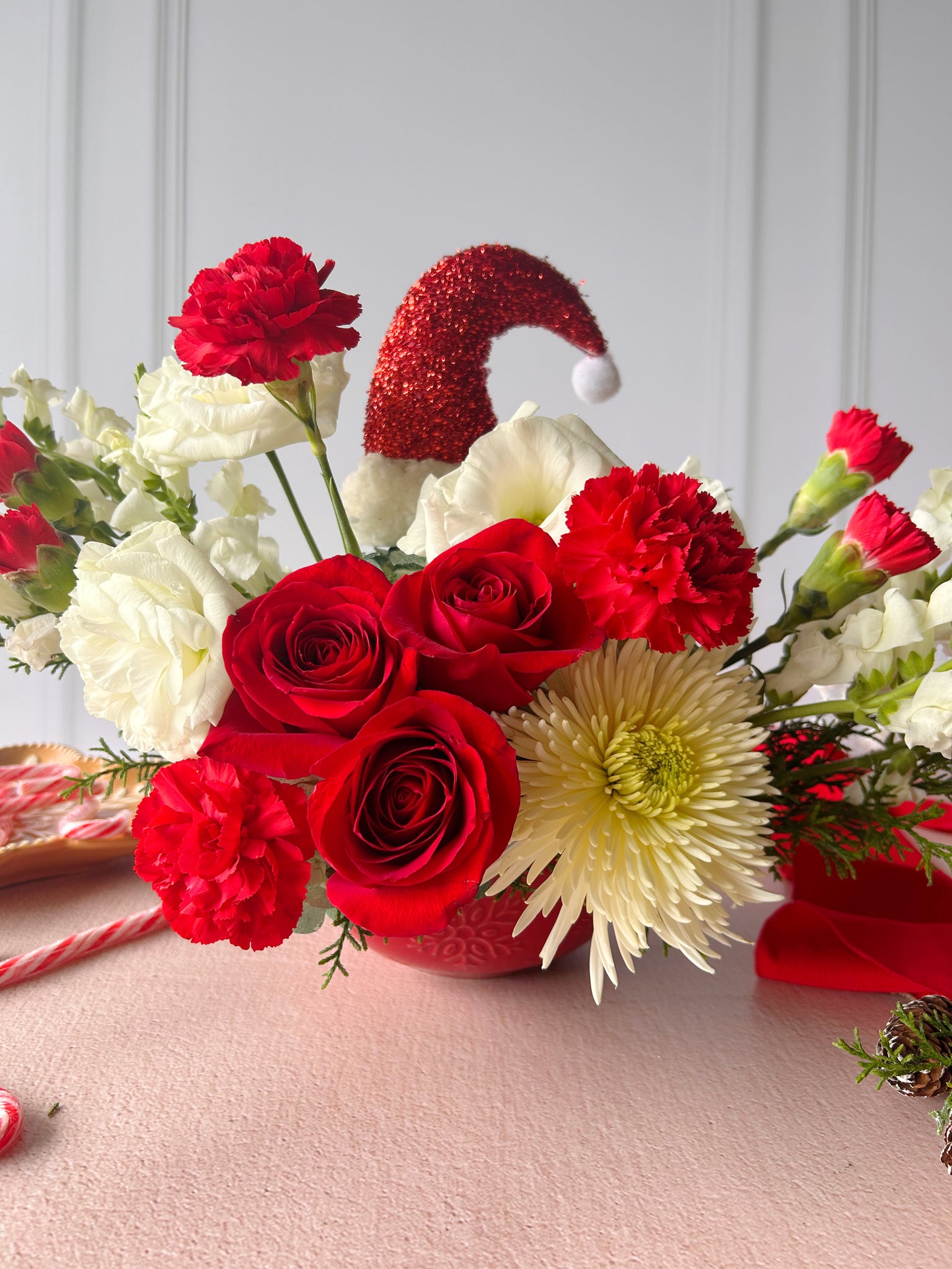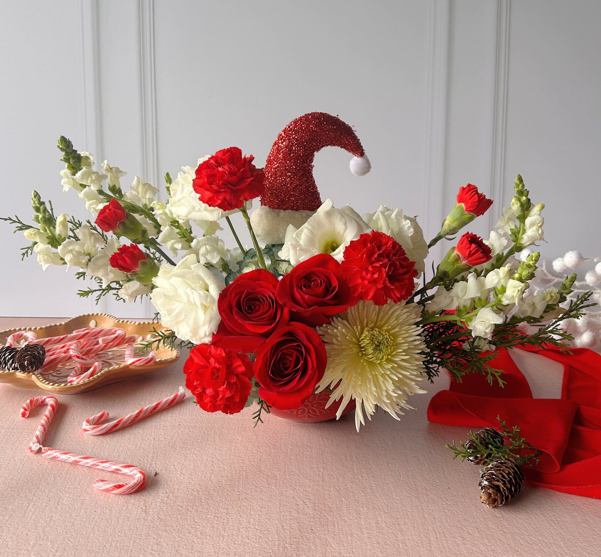 - Arreglo navideño elaborado con flores premium y acentos de ciprés invernal.