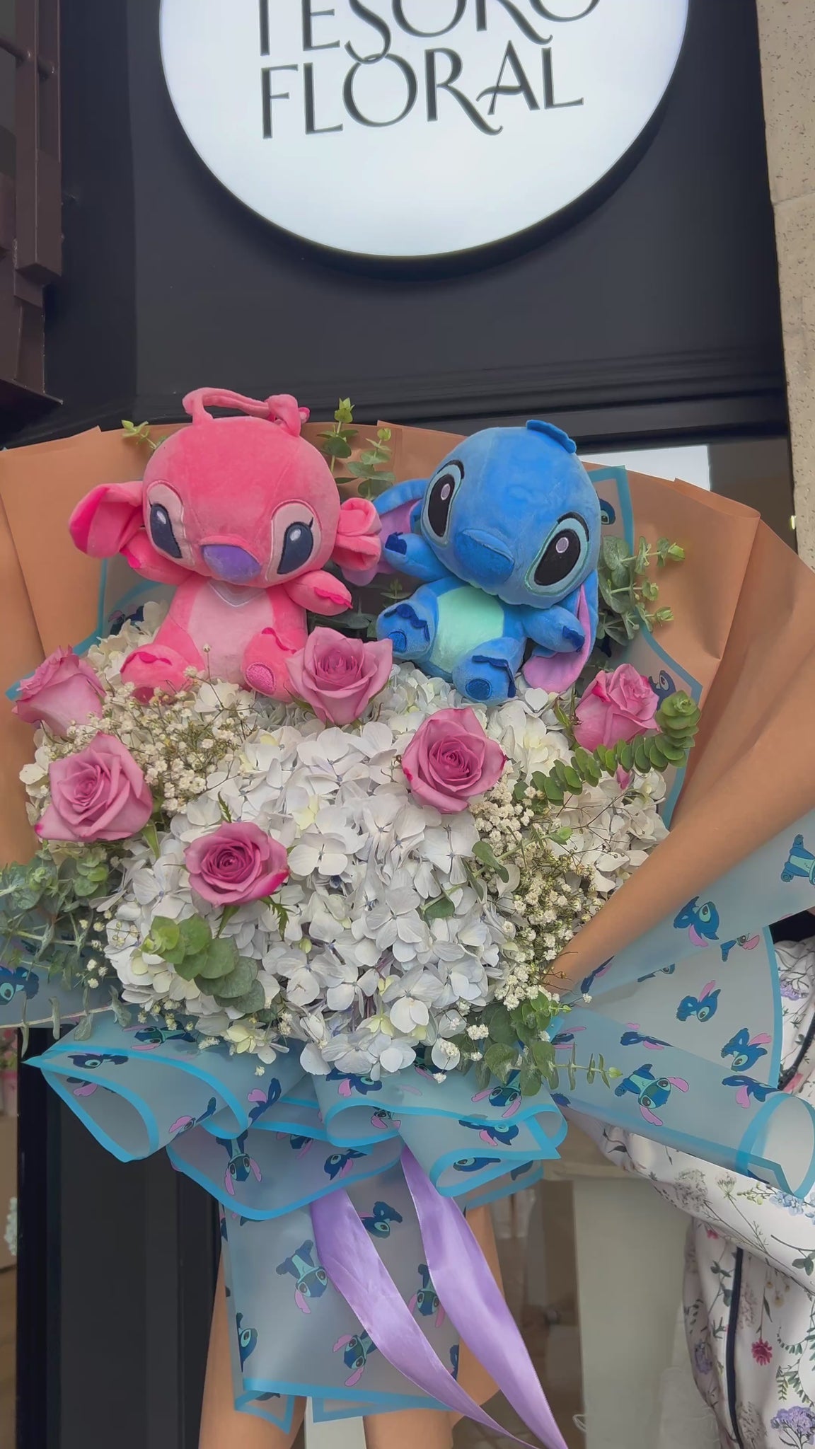- Increíble ramo con un peluche de Stich y Ángel, la novia de Stitch, los famosos personajes de Disney.