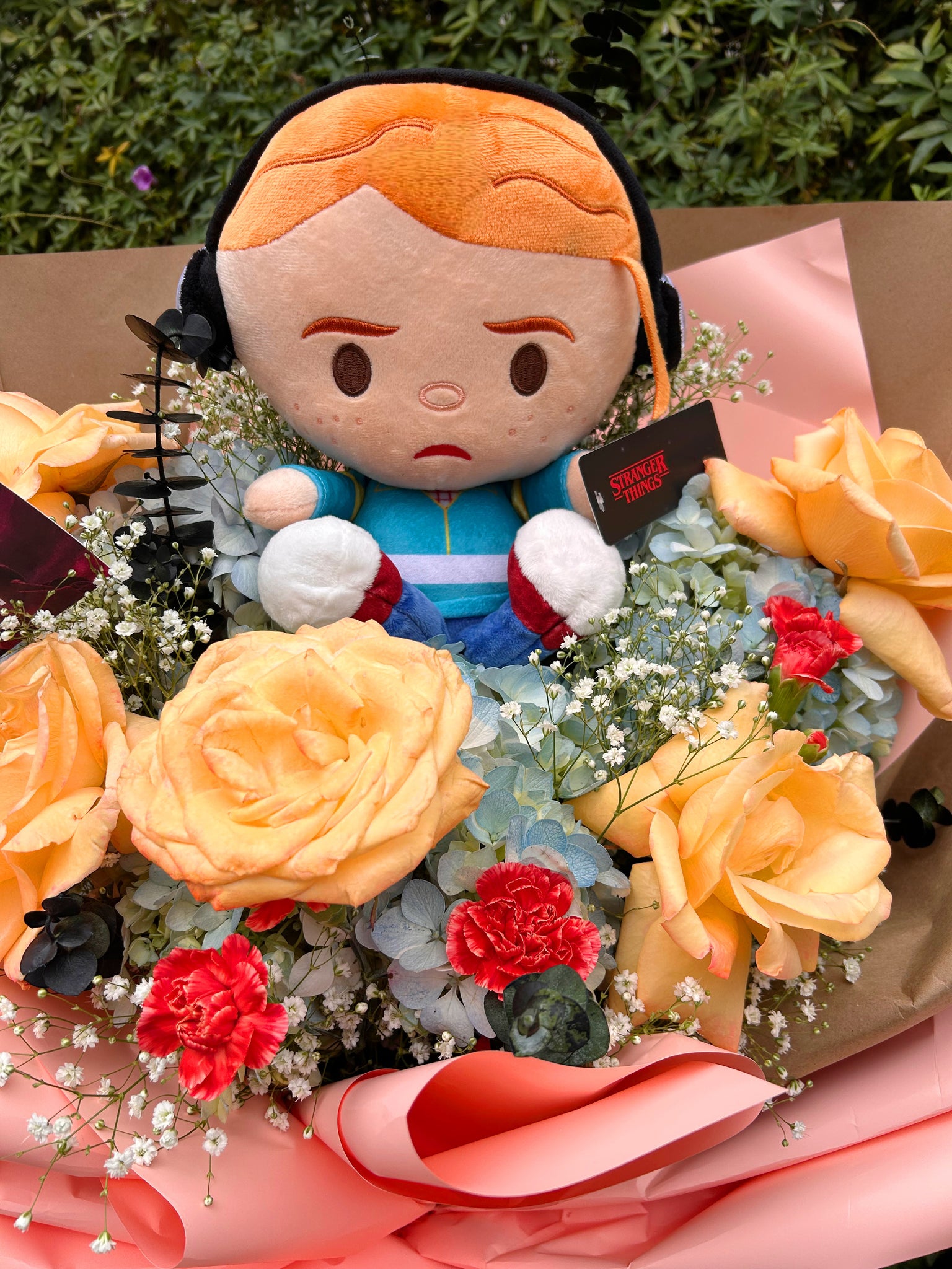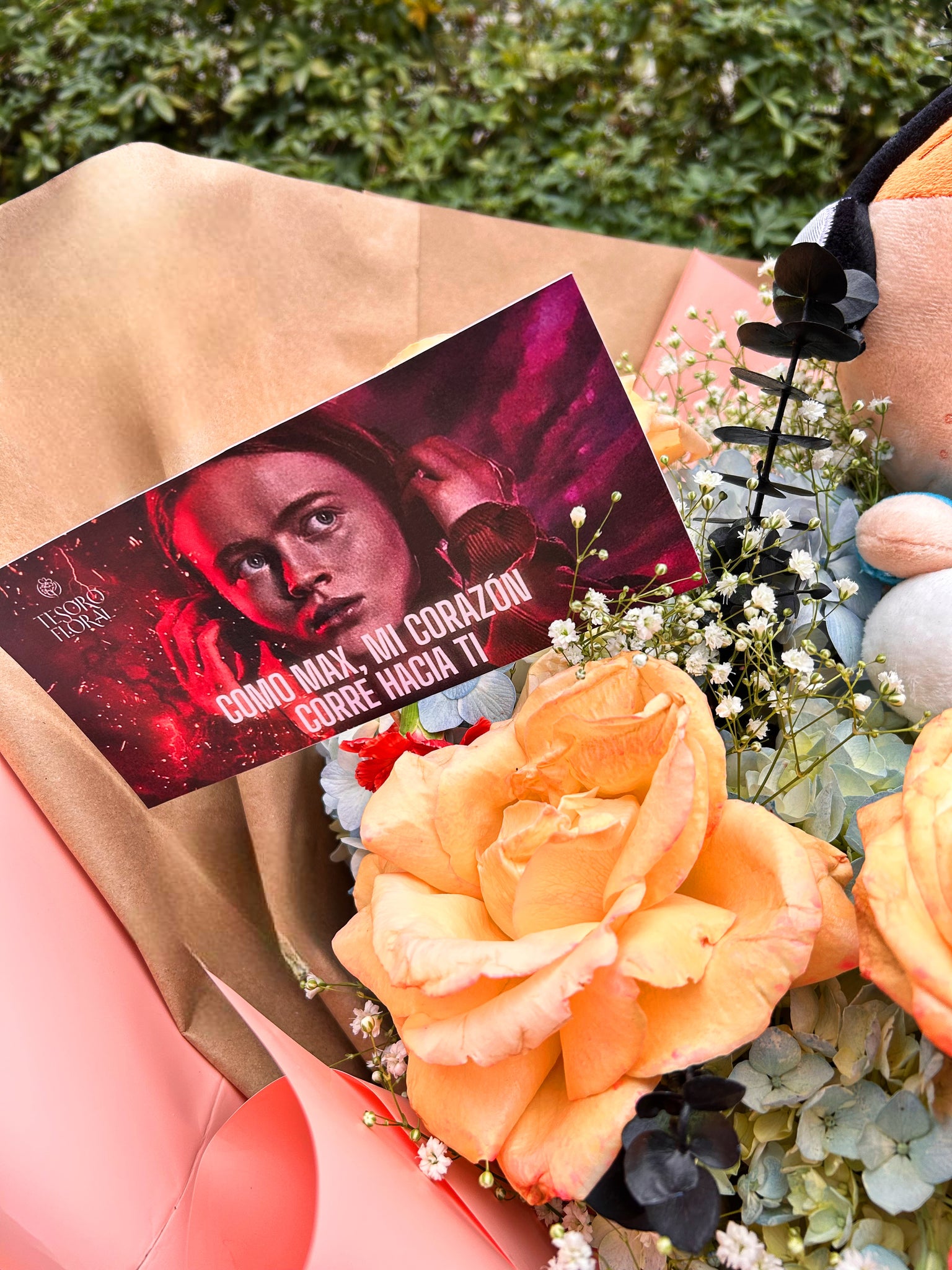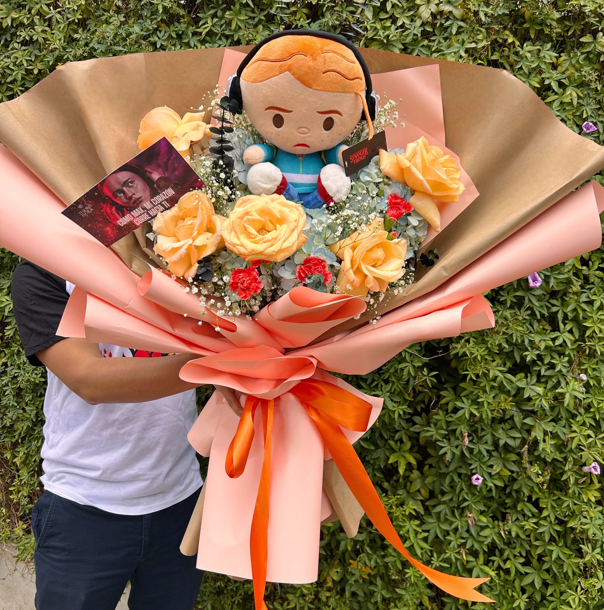 - Ramo XL inspirado en Max, con flores en tonos durazno estilo “Upside Down”.