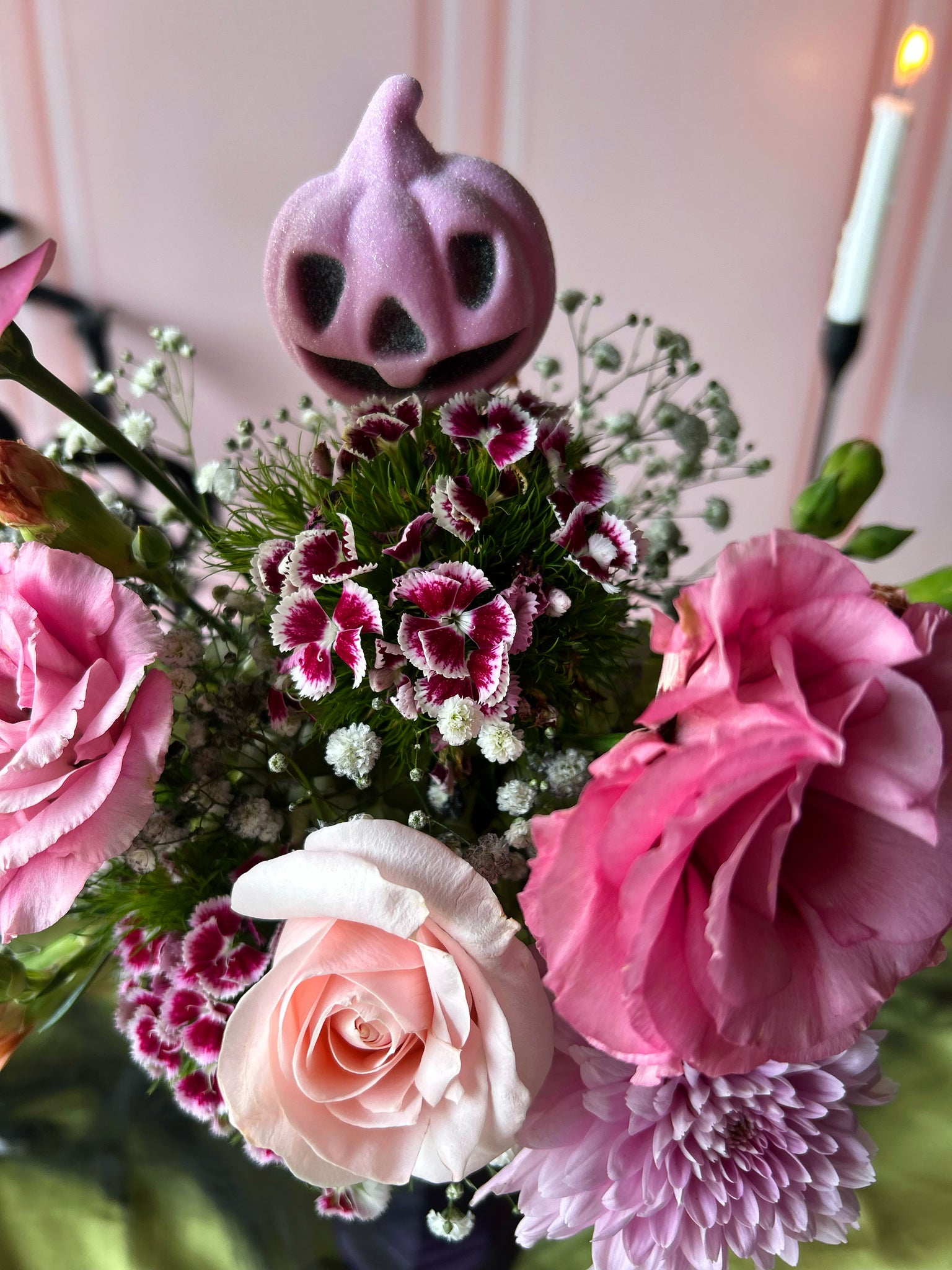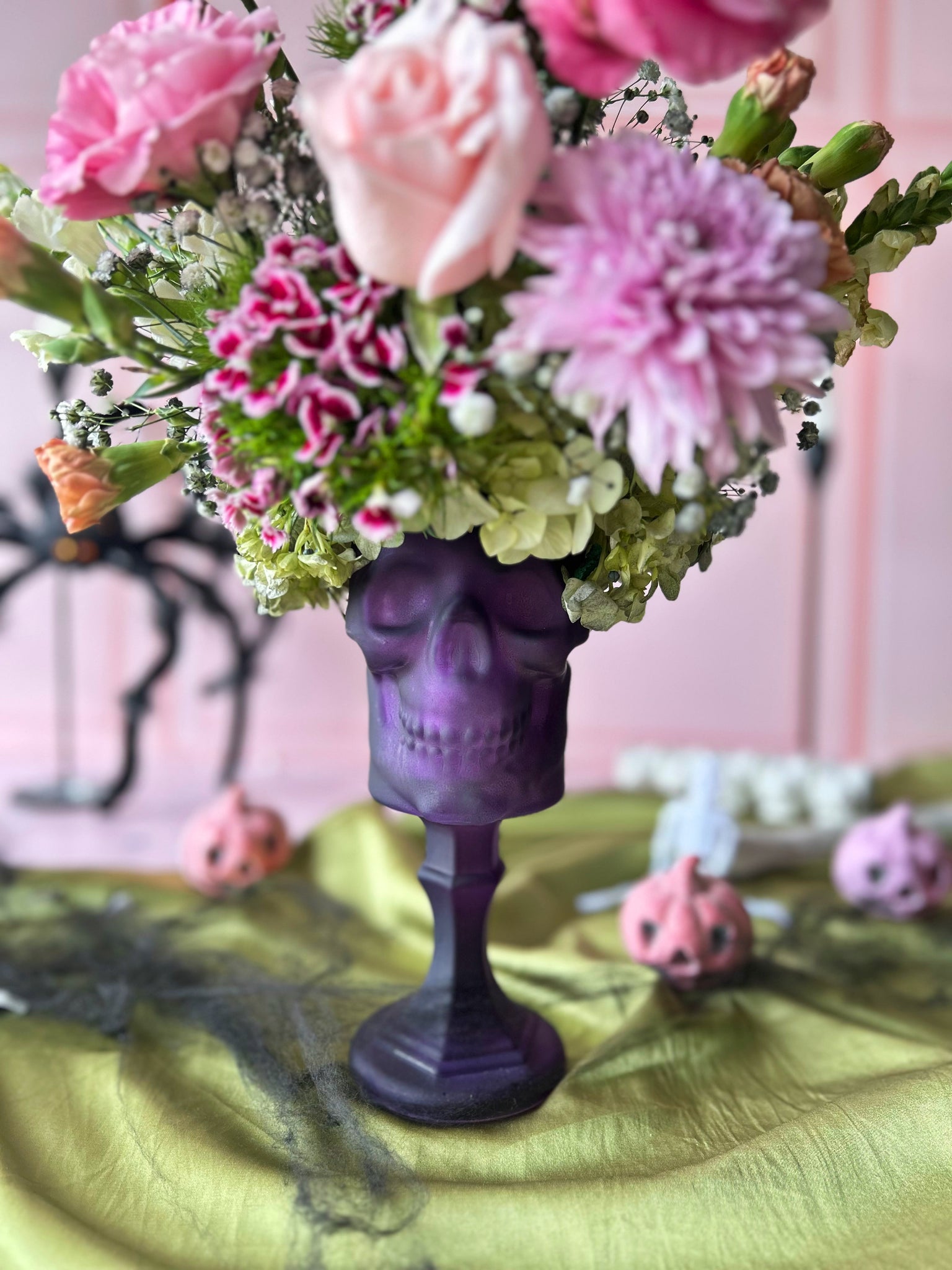 - Bello arreglo con temática de Halloween con una base en forma de calavera