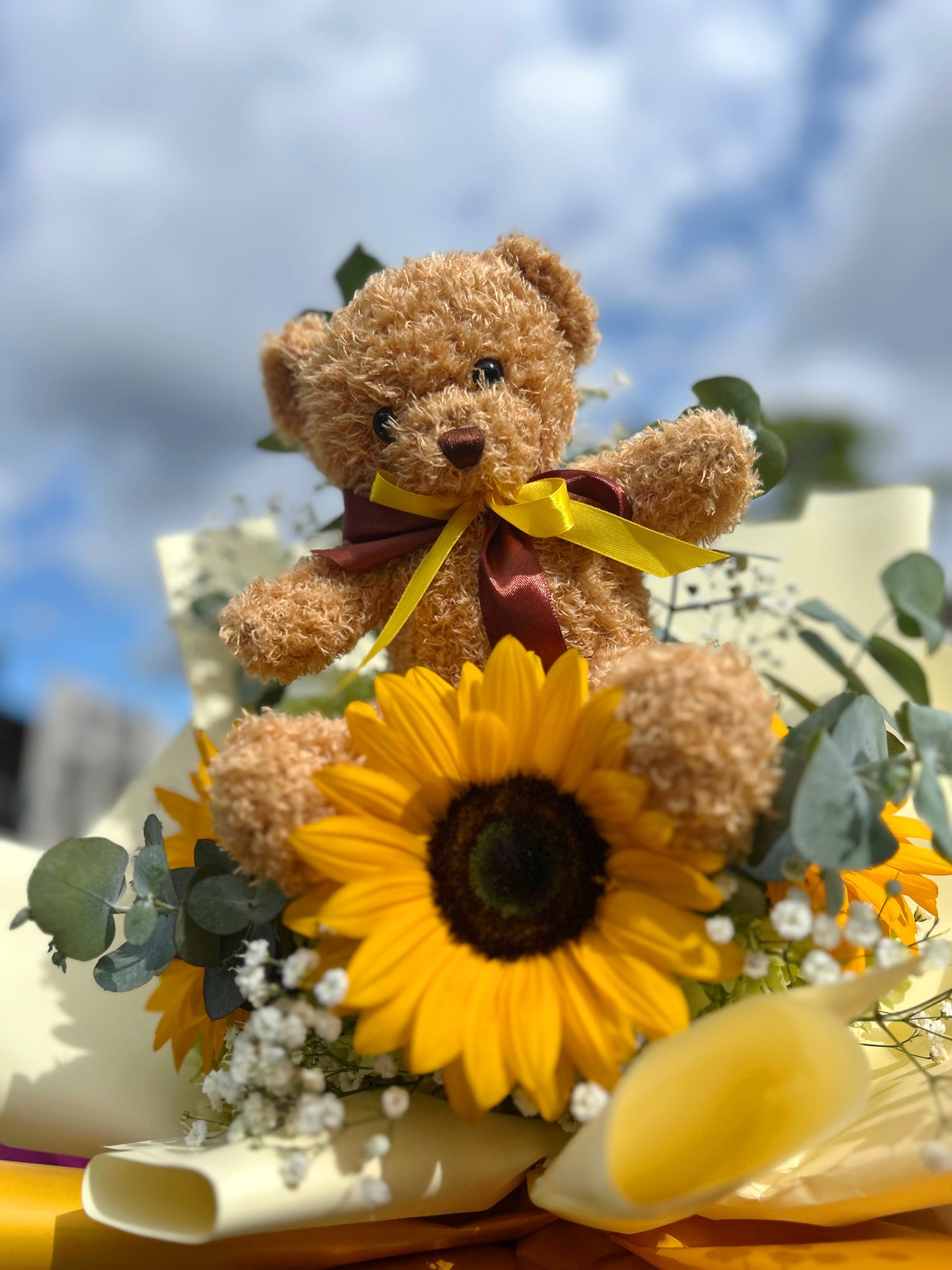 - Incluye un lindo peluche de osito en color café y un diseño floral con girasoles, Hortencias y más detalles.